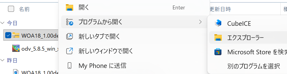 重要(つまづき所):ダウンロードすると、Windowsであれば「Download」フォルダに、Zip形式に圧縮されたファイルが保存されます。それを、ダブルクリックして、当該ファイル(woa2018_odv実行ファイル)が見えても、実際には使えません。圧縮ファイルを「解凍」や「展開」する必要があります。下のように、ダウンロードされた圧縮ファイル(フォルダ状)を右クリックして、【プログラムから開く】➡【エクスプローラ】を選びます。