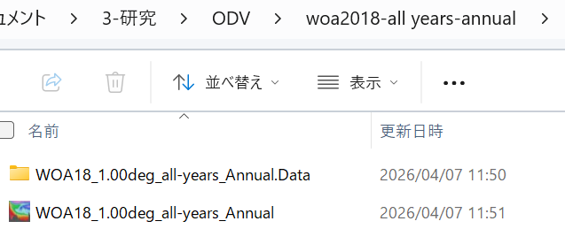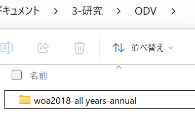 例えば、documentフォルダに、ODVという作業用フォルダを作りました。さらに、その中に「woa2018-all years-annual」フォルダを作り、上で解凍したファイルとフォルダを保存しました。