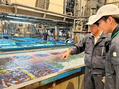 東市グループの共同水産株式会社様を見学させていただきました。加工場では徹底的な衛生管理の下でサーモンなどの水産物が丁寧に加工されていました。加工やパッケージ作業は機械化が進んでおり単純作業が多いイメージがありましたが、定規を用いて正確に加工するというお話などもあり、匠の技が光る現場であることを実感しました。
