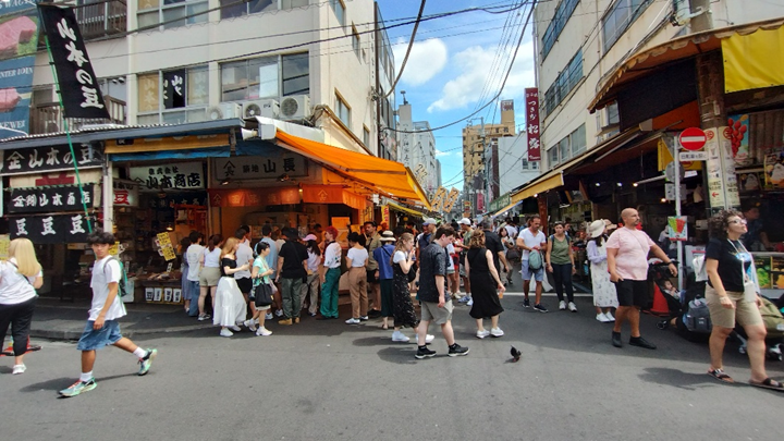 築地場外市場の様子を見学しました。非常に多くの人でにぎわっており、外国人観光客も多く見受けられました。迷路のような細い道には所狭しと小さな商店が並び、お店の人や商品との距離がとても近く、あたたかい雰囲気があって豊洲市場とはまた違った魅力を感じました。仲卸の市場では全国から様々な水産物が集まっており、北海道の市場では見られないような温暖海域性の魚類を見ることができてとてもワクワクしました。