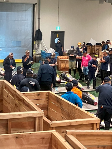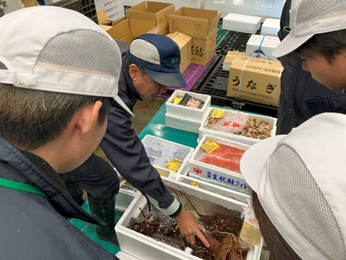 実際の市場の様子や、ウニ・ハモ・マグロの競りを見学させていただきました。特にマグロの競りは印象的で、マグロが一面に並べられた広場には鐘の音や競り人の力強い声が響き渡り緊張感にあふれていました。また、市場の見学では商品となる水産物を間近に見ることができて、とても楽しかったです。特に印象に残ったのは活魚ボックスです。実際に使われている様子を見るのは初めてで、遠方から生きたまま魚を運ぶことの難しさを感じました。職員の方が自身の担当する魚種について、生き生きと語ってくださっている様子が印象的でした。