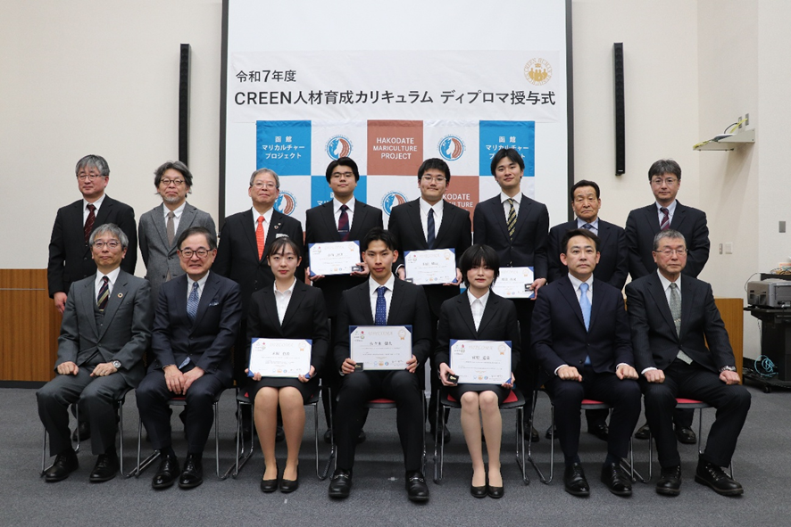 令和8年3月26日、CREEN人材育成カリキュラム ディプロマ授与式を執り行い、関係者列席の下、CREEN人材認定者へ北海道大学大学院水産科学研究院地域水産業共創センター(以下、共創センター)の都木センター長よりディプロマが授与されました。